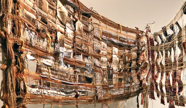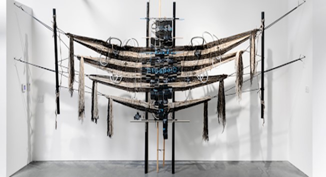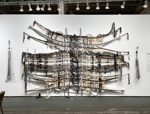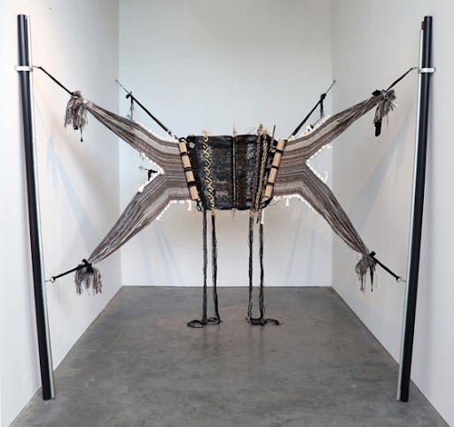 Dominguez Hultgren stated that her work is as much about the competing, disparate woven fabric, as it is about the space in which the work exists. Posts extend the work outward, acting as frame and architecture. Posts mimic the architecture of the gallery while also referencing the indigenous Mapuche vertical post looms on which these fabrics are made. The artist emphasised it is the yet-to-be woven or never-to-be woven parts of these weavings… Spaces, cracks, tears, all point to the possibility of what more there might be, of new terms, new bodies, and new architecture.
