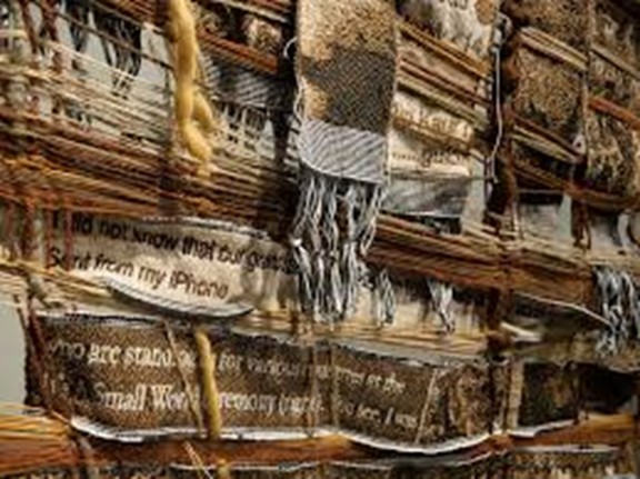 As I heard this artist communicate her relationship with her materials and weaving, of the materials telling her what they need and where they need to go… I could continue to relate and respond readily as the used, reused, repurposed, and found materials I use appear to replicate some of this creative process, of a maker interacting with her materials, of the interactivity of the context which can be read through the textiles surface imagery, structure, and materials as mediums for communication. I therefore mediate meaning through the relationship with materials in creative process, of expressing embodied knowledge of context through print and weave to give a tangible or visible form to an idea, quality, or feeling through and within the materials in use.