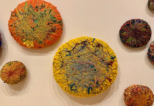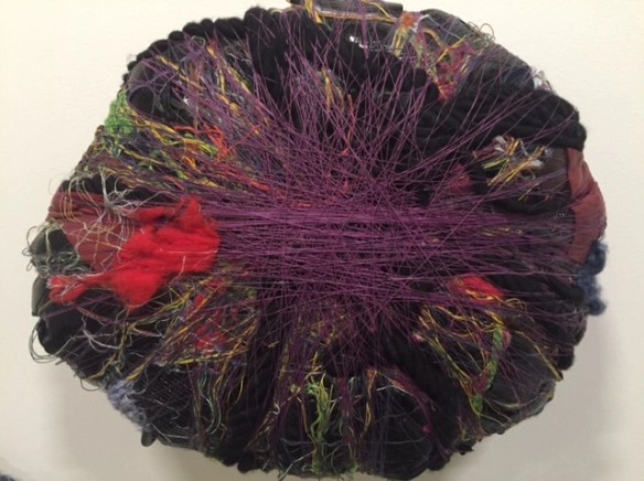 In “Scattered Memories”, a more recent piece (2017-18), a wall is covered with balls of cloth, fabric, and things that Hicks has gathered. Although it looks like a wallpaper in 3D, on closer examination each form reveals itself as motifs of memories, which represent moments in time, of the unveiling of the artists identity as a series of memories-visually and emotionally complex objects in themselves, created by Hicks in a moment of synthesis. The raw facts of synthesis — the threads uniting different pieces of memory, the objects that represent memory themselves. Underneath “Scattered Memories”, a glass vitrine displays various diaries, notebooks, and other memorabilia that have belonged to Hicks over the years to best illustrate her use of self within a lifetime of memories within a designated space. Through such research processes I have become increasingly mindful and aware of the use of space within my own environmental context. I can relate with how my own experiencing can connect with space and body on both an interpersonal and intrapersonal way. I am increasingly seeing my creative process and textile work from different perspectives to help me to start to evaluate new options and possibilities using installation through mixed media approaches including weave, stitch, and print.