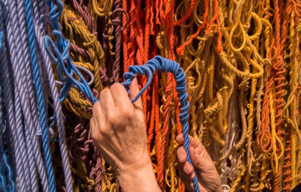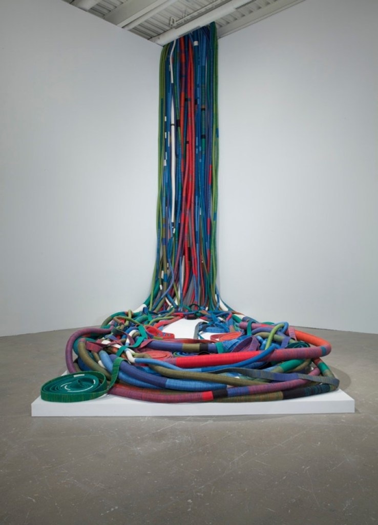 More recently much of Hicks’s work is large scale and inhabiting space in defined ways. May I Have This Dance from 2002 was commissioned by Target Corporation for its corporate headquarters in Minneapolis. When the space was reconfigured in 2010, it was dismantled and reinstalled at the Institute of Contemporary Art in Philadelphia. As Hicks stated, “It is what I call “transcendent sculpture,” which means it can be adjusted for spaces of different sizes and completely rearranged. It is strongly structured, but it is anti-structure in that it has infinite shapes and sizes. Textile is one of the few materials in art that is consumed by the object’s form or narrative. It is materiality and manufacture — threads, warp, weft — are always there.” I am influenced by this artist’s use of space, narrative, and context, of her use of self and her own experiencing within and throughout all her textile work and creative processes.