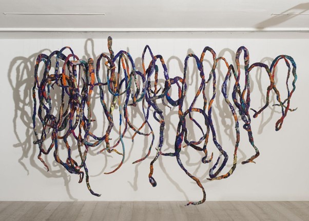 From the completion of Textiles 3 Personal Specialism and Research I have managed to progress my creative practice to continue to increase the scale of my work, to utilise material preferences linked to relating and the environment and to obtain a visual aesthetic and reference point which relates to contextual relevance. The creative process was and continues to be seen as vital to my developing personal and professional knowledge and understanding of who I am as a textile artist and what I am trying to communicate through this process. How I think and reflect upon my work has continued to shift and change…to evolve as I have encapsulated new and varying influences through research and making. I am aware of the continuing need to push myself to take ever greater risks to be increasingly imaginative, experimental, and inventive through ongoing engagement and connection in research processes, creative practice, and to increasingly communicate how my work addresses related environmental themes. Through such research I have become increasingly aware of and use a wider range of materials and I am increasingly aware of their related value through their lived experience, so it feels important to reuse and repurpose to tell their stories through the making processes for ongoing environmental gain. I am particularly interested in creating and making for interiors including residential and public spaces, to communicate my environmental context through the creative processes and materials used.