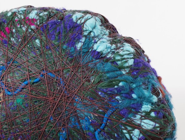 Therefore, a central tenet to Hicks’ work is memory, self, and space. “Memory is a powerful tool that helps internalize the sense of an artwork; the profundity, meaning, idea, significance; that which we think is the essence, or aura, of a piece of art. And of course, memory is linked intimately with the self. Hicks works not only with material that she gathers from her travels, but also from what she can gather from people close to her — her friends and family. All of her works are therefore ‘pockets of memory’: the use of fabric and textile, wrapped and twisted to form shapes, things, and ideas, turns tangible things into a pocket for an abstraction like memory.”