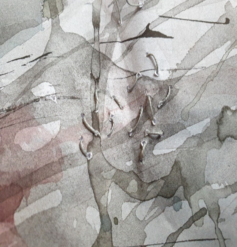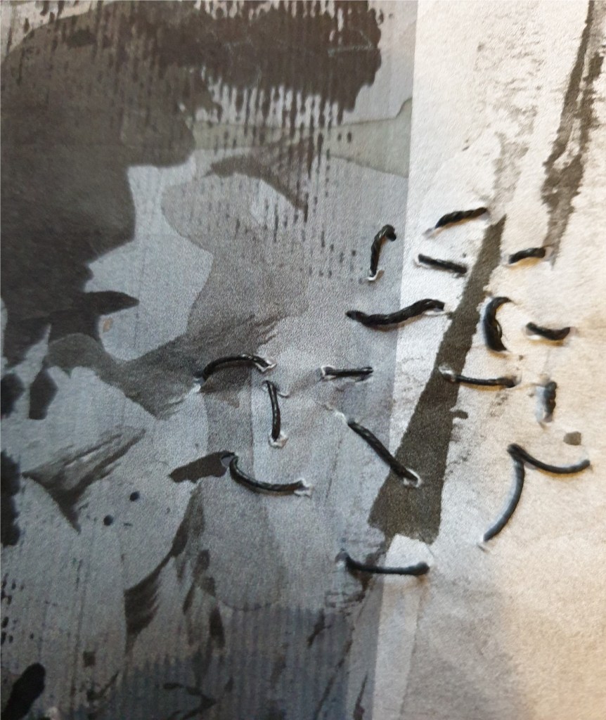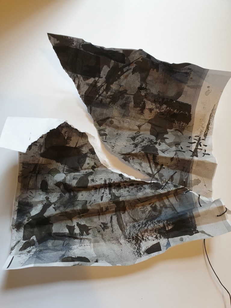Experimentation processes have used paper mock-ups to investigate how the printed paper reacts and responds to and with hand stitching. To rip, tear, rupture, and split, to fold and crease to increase my understanding and connection with such processes and their effects, to help create and evoke responses in me. To use hand stitching on my multi-layered prints to explore a greater sense of layering of print with stitch to help evaluate these initial ideas of crisis and recovery within the material in use and in me to help inform the next series of creative processes within larger-scale sampling involving screen printing with stitch.