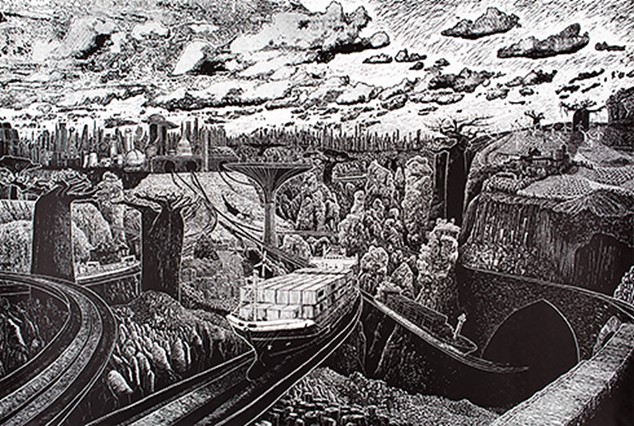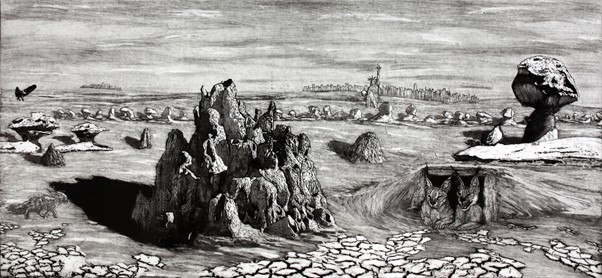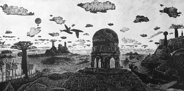 Ade Adesina, born in Nigeria 1980, is currently a full-time printmaker who lives in Aberdeen, Scotland. He previously studied printmaking at Gray’s School of Art, Aberdeen from 2008-2012. What I like about Ade’s work is that it is a visual commentary around the ideas of ecology and our ever-changing world. He is fascinated by how the human footprint is affecting our planet. Our world is full of wonderful landscapes and Ade wishes to highlight the continual damage caused through things such as deforestation, the politics of energy consumption, and endangered wild species. His use of print to create apocalyptic scenes has influenced how I use print to create scenes which depict preferred narratives. As a contemporary printmaker, painter and sculptor with traditional skills used with a modern twist, he uses mostly linocut, etching, and oil paint to achieve his desired effects. The artist mixes his African cultural roots with British culture, for work that makes people reflect on the past, present and the future.