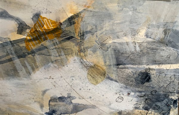 Of particular interest is her use of acrylic paint with a range of mixed media especially inks, charcoal, varnish, and pen. Mary MacKay seems to bring disparate elements to life through their assimilation onto paper, card, and canvas. I feel that her paintings with several hand printmaking techniques would translate well into textiles given the broad range of mark making, materials, techniques and colour used. I aim to be increasingly freed up with my own use of mixed media going forward.