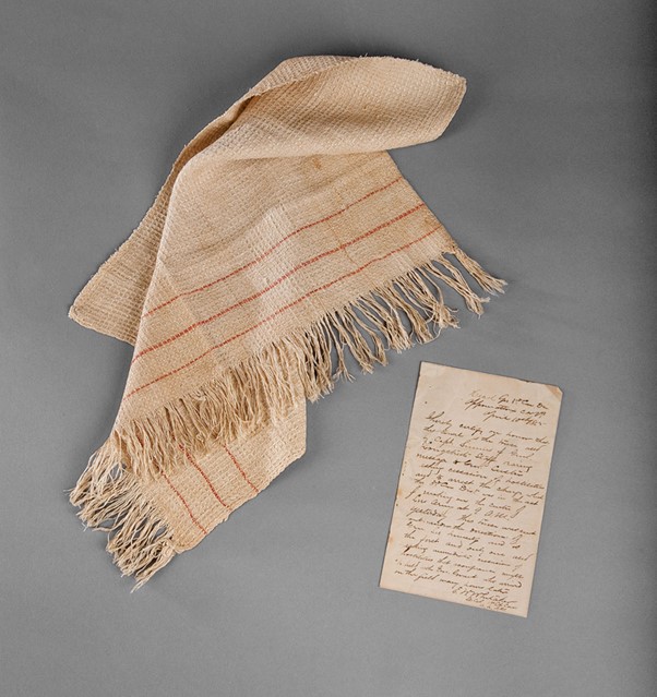 Description: In April 1865, a dishtowel was repurposed as the Confederate Flag of Truce at Appomattox, Virginia. The humble cloth ended the Civil War. It was divided in half and one half divided further. As Clark noted “The half at the Smithsonian American History Museum compelled me to make it whole, to make it a monument of peace, an antidote to the recurring symbol of the Confederate Battle flag. This divided country is in desperate need of healing its deeply festered wound. That most people do not recognise the cloth that ended the Civil War, is evidence the war never truly ended”. Sonya Clark offered this replica truce flag as a salve to the body of our nation.