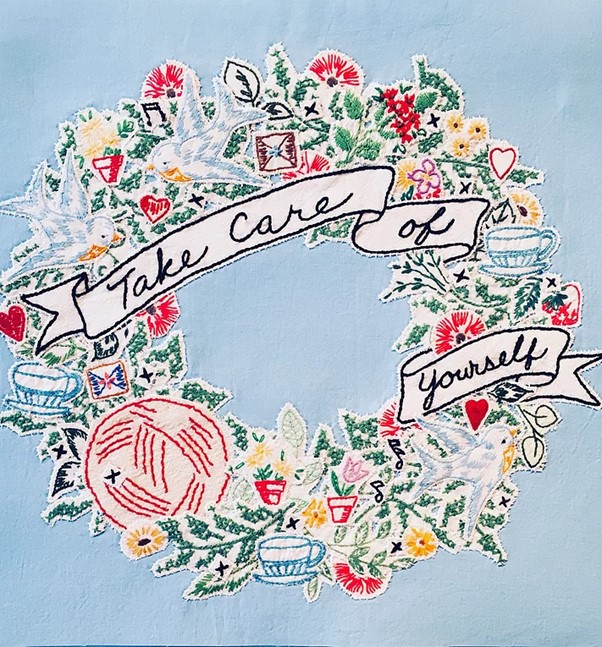 Maggy Hiltner set herself to stitching natural and manmade disasters into her landscapes as she continued to research these ecological problems. Maps and illustrations drew Hiltner to include portolan lines and vanishing points—adding movement and a linear design element and poking fun at her tendency towards flat representation. “I included found embroidery cut from countless tablecloths and handkerchiefs” and the artist generated a list of terms and places picked up from headlines, news stories, and research. This text became a news ticker above and below, informing the individual scenes. The world Hiltner visualised is still beautiful, but the impact of human consumption and waste is everywhere. https://cehs.unl.edu/maggy-hiltner-vantage-point/