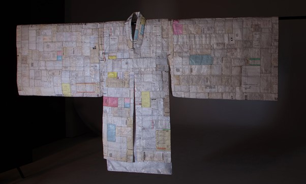 Dong Kyu Kim stated that his work is composed of paper receipts, tickets, envelopes, and documents, as well as plastic and paper shopping bags and stickers. Each item provides a record of his various activities at a particular place and time. The receipts and shopping bags that he collects represent capitalism, consumerism, and his aspiration for wealth, status, and success. As he experienced the radical reshaping of the global economy, along with increasing globalisation, he became obsessed with the capitalistic ideals of money, fame, and success so his work asks questions about the impact of American capitalism on one’s values. It is an examination of the roots of human experience, of one’s desires, and how we all determine value. He sews the papers and other materials together by hand to create a patchwork. The repetitive and meditative act of stitching abandoned objects, leftover or discarded things (not special, unnoticed, undiscovered) helps him to record the passing of time and highlights the sanctity of labour.