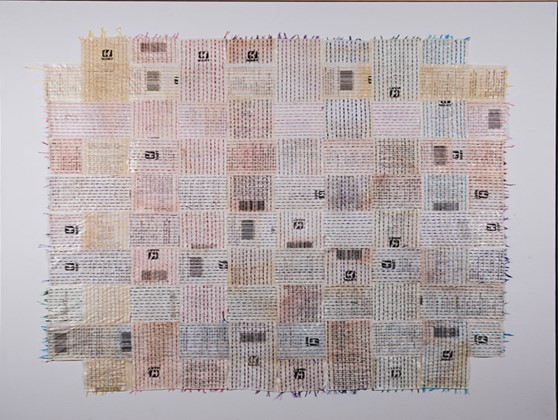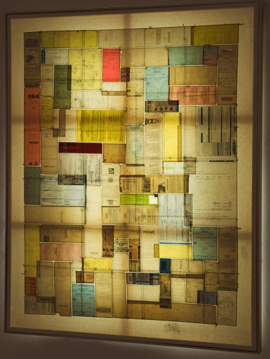 Dong Kyu Kim is primarily a mixed-media artist whose works are constructed from his vast collections of paper receipts, tickets, and other materials which have been accumulated over the past 10 years since relocating in the US in 2007. Through his hand sewing his work explores his relationship to the US and how his own identity has been informed and defined by the concept of the American dream and how individual lives are affected by transitions in global economic structures. The work of Dong Kyu Kim occupies a middle place between craft and painting. His art is typically the result of manually stitching items, and each stitch has its own character, like a gesture; and each receipt reveals a different part of the artist’s psyche. TransAmerica for example details Dong Kyu Kim’s consumerist habits, re-imagines the American ideal of individuality and buying power in the form of manual labour devoted to stitching together mementos of experiences that the artist felt could be revisited again and again. http://www.garageartcenter.org/exhibition-single-dongkyu.html