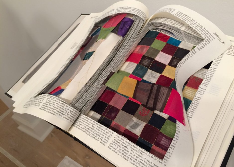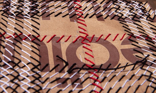 This exhibition ‘Material Memories’ featured Dong Kyu Kim’s hand-stitched mixed media works which explored the boundary of useless and priceless. Material use has been extended further to include a collage of brown paper shopping bags and packing tape with hand sewing different crisscrossed stitches using various colours of thread to create layers and pattern. His work asks questions about the impact of American capitalism on one’s values, and what motivates a person to want more and more. He examines the roots of human desire coupled with value to better understand himself and others. https://www.dongkyu-kim.com/artwork.html