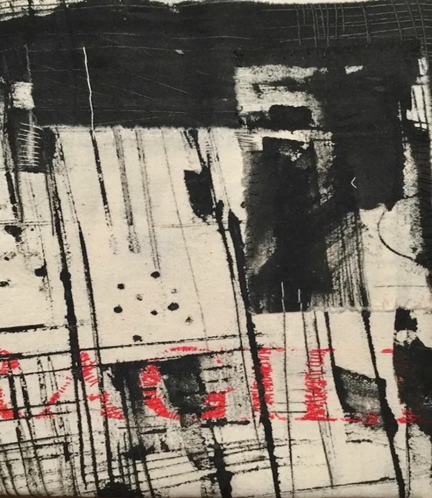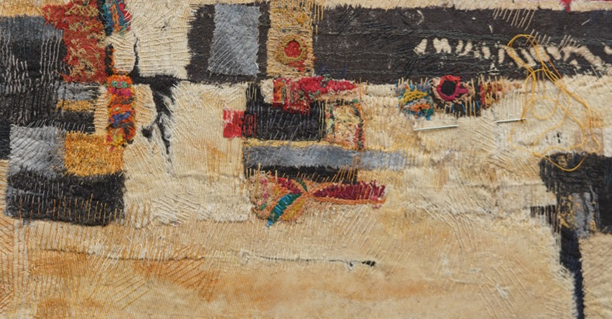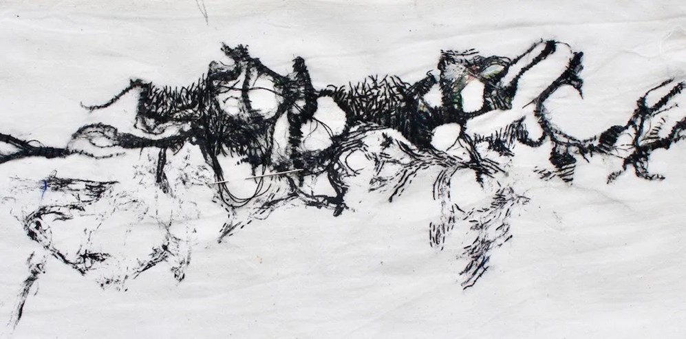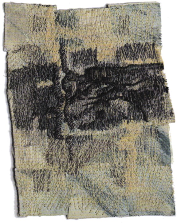 Themes were explored around ‘Fractured’ which were very personal to the textile artist. In this project, a change in scale and approaches to working developed. In 2017, the Textile Study Group staged DIS/rupt, an exhibition concerned with disruption, covering a range of themes. It ran during the time of aerial bombardment of the city of Aleppo, Syria. Television coverage gave daily aerial views of the devastation caused, and ‘Fractured’ reflected upon the theme of conflict. Changes within the creative process have been commented upon and evidenced more recently given the continuing world-wide issues instigated by mankind through armed conflict, with negative effects on families and communities on a huge geographical scale. Gwen Hedley noted that she researched aerial plans, noting lines, grids, symbols, and divisions of space. Using simple tools and diluted paint, she drew onto several large areas of calico, working freely and spontaneously making marks representing a city plan and then ripped the drawing into pieces, then rearranged and re-joined it with simple hand stitches into a totally fragmented and broken city plan. Gwen Hedley said that she made two more pieces of which one piece was entitled ‘Formerly’ is light in colour and markings, referencing an aerial plan before the war. The work ‘Fractured’ represents the devastation from constant bombardment. ‘Finished’ depicts total loss of hope and the final fall of Aleppo; it is composed of patches in different hues of black, with no other colour at all. Together, they form a triptych entitled ‘Narrative of Ruin’, with ‘Fractured’ being the central panel.