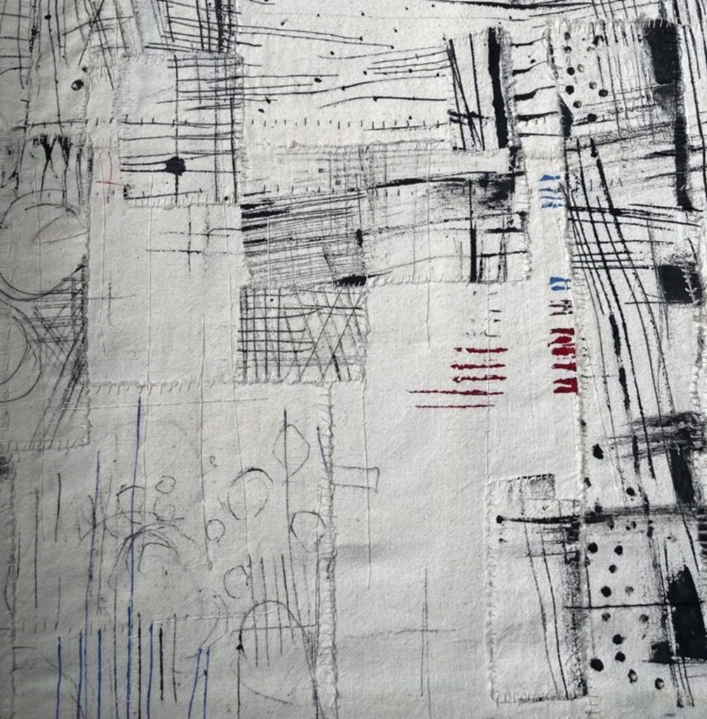 Gwen Hedley focuses upon the construction of contemporary textile pieces, to use cloth, paper, paint, and thread and is concerned with changes in surface and structure, wrought by the ravages of time and elemental forces. That said Gwen Hedley is particularly drawn to the weathered materials she finds in her coastal explorations. Walking the local landscapes, she is drawn to dilapidated found objects and worn surfaces. The textures and scars show the passage of time, and this is what inspires her. From owning Drawn to Stitch: Line, Drawing and Mark-Making in Textile Art (2010) by Gwen Hedley since its original publication date I have been continually drawn back to her work with textiles. Given this textile artists preferred aesthetic, use of aged, reclaimed materials, her creative process, and love of natural wear and tear I can readily relate to such a creative ethos based upon environmental significance with material use. I have used natural linen materials and different types of paper in creative practice especially for a range of sampling processes with print to use hand stitching. I am currently utilising hand stitching to communicate a preferred narrative concerning mental crisis and repair using vintage linen threads on screen printed vintage linen bedsheets, so her creative processes and work have been revisited.