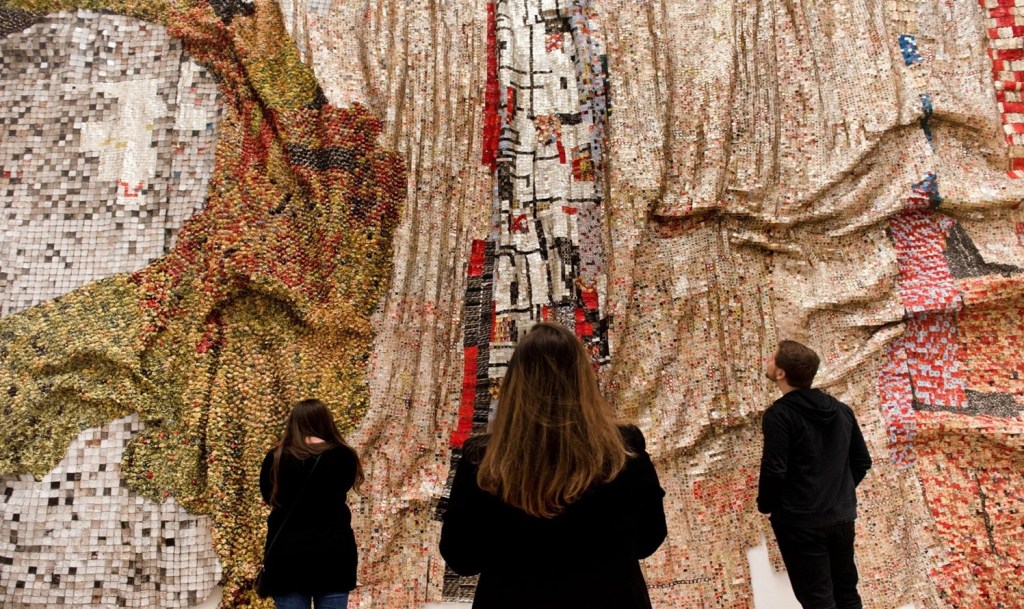 As stated, a major new survey celebrates the creative reclamation and nurturing spirit of Ghanaian artist El Anatsui. He developed his artistic philosophy – of using what the environment throws up as medium as he emphasised ‘You should look for things around you, and not look for anything else, because if you find materials from around you, you will do work that relates to your location and circumstances.’ He has held on to these foundational principles and experimented with wooden mortars, broken ceramics, cassava graters, printing plates and milk tins; creating work with fluid forms, reminiscent of textiles, upsetting categories of sculpture, exploring the reuse and transformation of materials, proving how these materials are at once local and specific and yet transcend place. ‘My work has freedom as its watchword, the idea of freedom being able to shape itself or get shaped in different ways.’