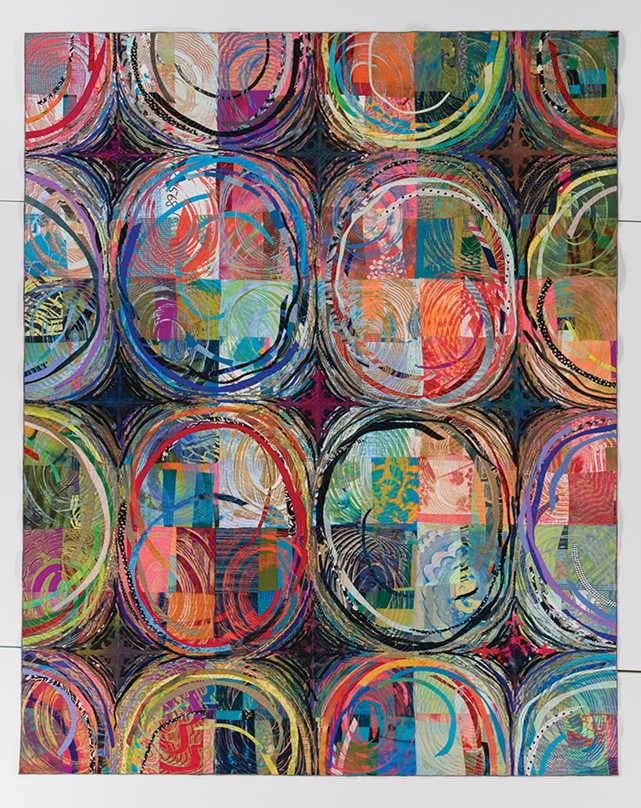 In her Cellular Structure series, Sue Benner thinks about the layering of structure and looks deeply to see what is beyond the surface. Her education in biomedical science inspires artwork concerned with the human body and the microscopic universe. Benner sees a direct connection between the concept of quilting and the assembly of units, whether in cells or fabric. These shapes inhabit her mind and are the building blocks of her world and art.