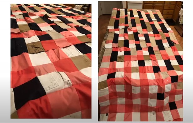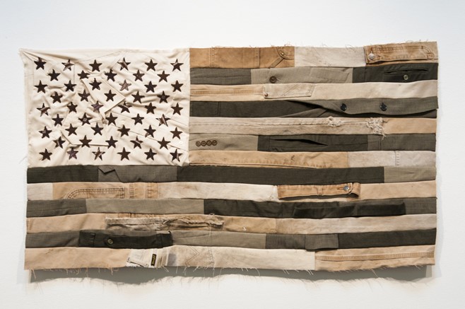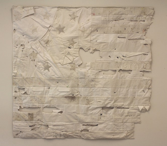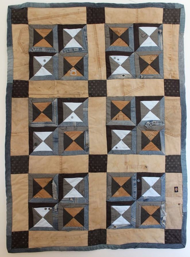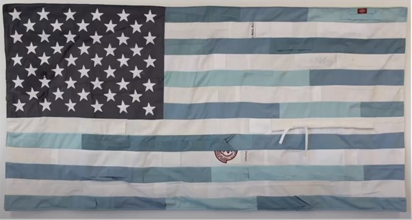 Flag Series- By utilising two classic American uniforms from white collar uniforms and blue-collar workwear, Carrington showed that the continued pride in the United States, the country that their workforce upholds can be honoured, revered, and celebrated. The act of sewing these two different types of clothing together into this hopeful icon is a call for the coming together of the union as one for the artist. Ryan Carrington used his own personal history, the meaning of hard work and the pre-worn work garments and incorporated them into flags to best represent both America’s blue and white-collar workforce to embrace and highlight the very fabric of the nation’s ever-changing society. The artist discussed the ideas behind his work and how his creative practice engages with labour, class, and the American Dream.