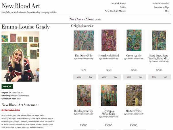 The artwork of Emma-Louise Grady has interested me for some time as I managed to see her graduate show in 2019 at the University of Dundee. The development of this artist from then until present day highlights her talent as a skilled artist, her unique creative process, and the positive promotion of her artwork through her own website, social media, and gallery exhibitions including both online virtual shows and on-site options. Through reviewing her progress including her most recent exhibition Wanderings I have been able to increasingly understand the processes involved regarding planning and organising exhibitions including the additional promotional strategies which are required to be seen, followed, and liked, to develop a customer base and added interest in what you do and what you have to offer. Through winning awards and scholarships this artist was able to capitalise upon an increased range of opportunities. While she was still in her fourth year at Duncan of Jordanstone College in Dundee, Emma-Louise won the Royal Scottish Academy John Kinross Scholarship, which gave her the chance to work in Florence for two months. In addition to this Glasgow firm Enterprise Mentoring chose her as their artist-in-residence, which set her up in a city centre studio and last year, she was given the opportunity to exhibit her work at the Royal Scottish Academy for its exhibition, New Contemporaries 2020, where she was awarded the prestigious Fleming-Wyfold Foundation Award, for ‘best painter or draughtsman/woman’.