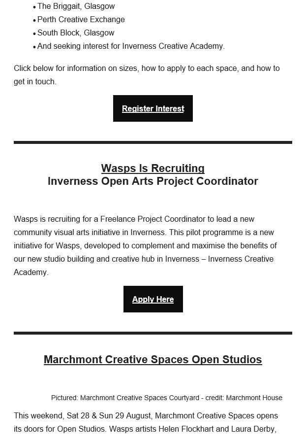 A recent example of the Wasps Newsletter which is digitally circulated monthly with all recent information including details for Exhibitions, Open Studios, Makers Markets, funding, studio spaces, recruitment options including permanent jobs, residences, and voluntary possibilities, arts programmes, selling/buying art, etc.