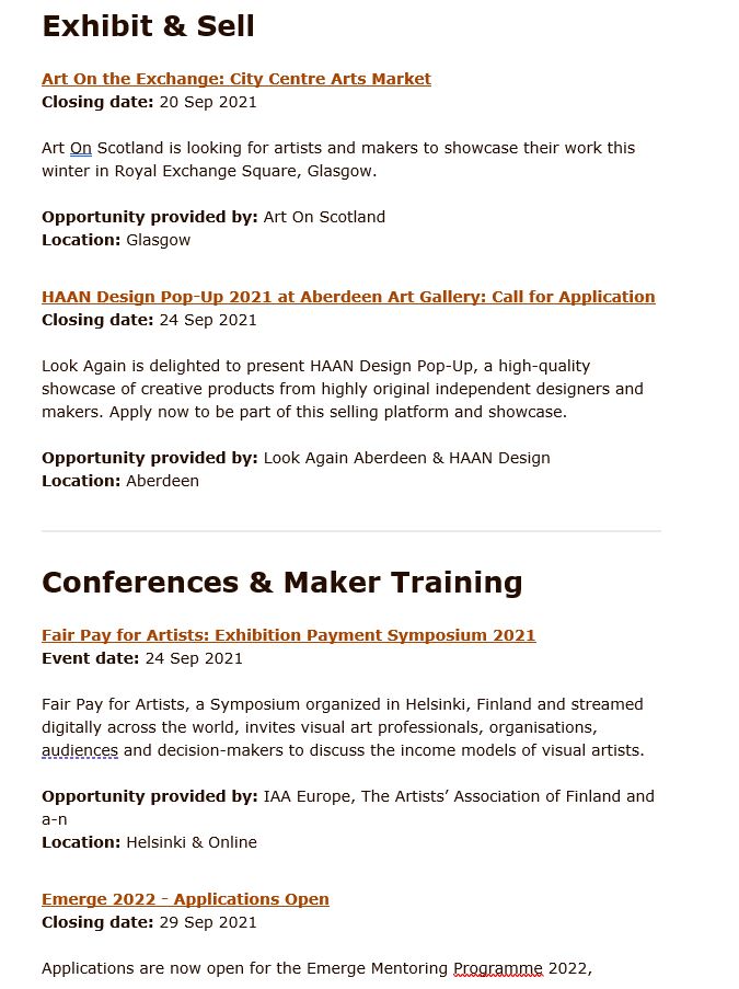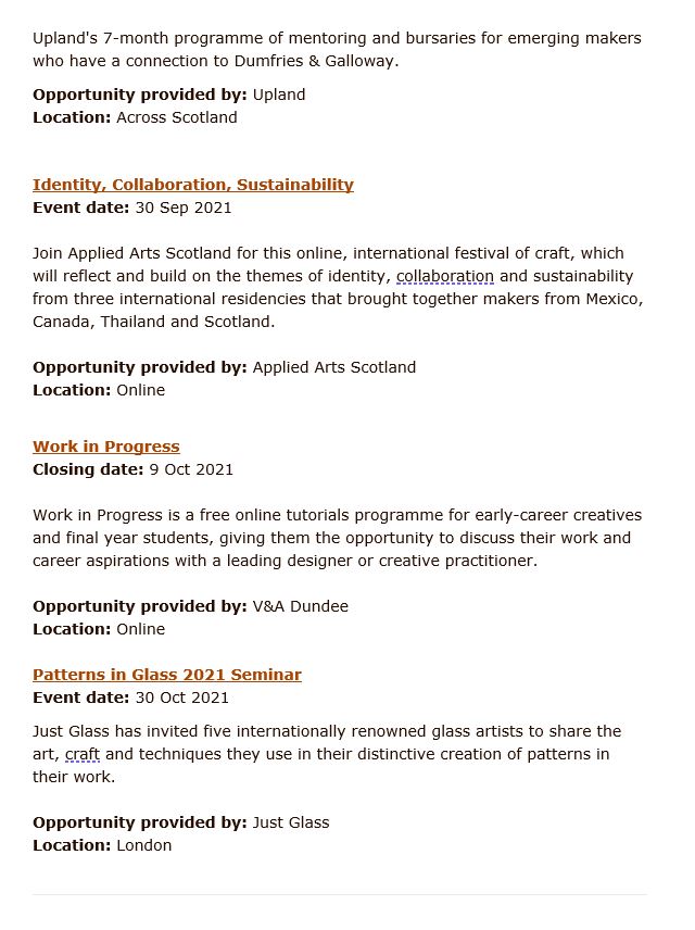 Craft Scotland Monthly Newsletter September 2021 which includes all funding opportunities in Scotland for artists.