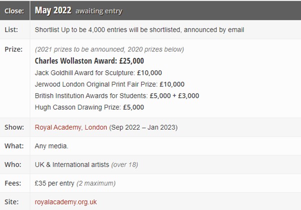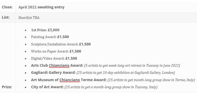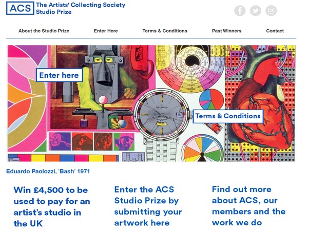 Artists’ Collecting Society Studio Prize. Founded in 2006 the ACS Studio Prize offers artists starting their career the chance to win £4,500 towards the cost of an artist’s studio in the UK. Pictures, collage, painting, sculpture, tapestry, ceramics, glassware, or photography all welcomed. https://www.acsstudioprize.com/