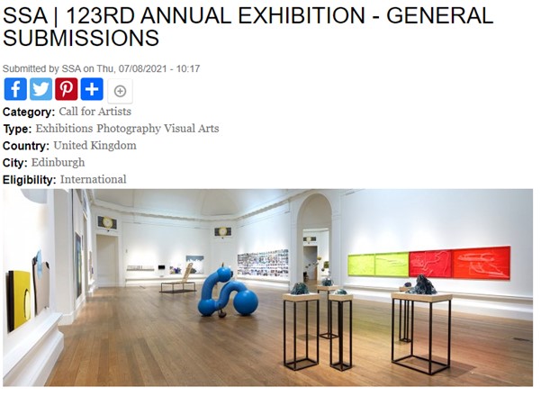 The SSA Annual Exhibition at the RSA in Edinburgh showcases the best of contemporary art to audiences more than 30,000 people. The exhibition is produced and supported entirely by artists with no public funding. It will take place from 1 November – 23 November 2021. https://www.artjobs.com/open-calls/call-artists/united-kingdom/50142/ssa-123rd-annual-exhibition-general-submissions#