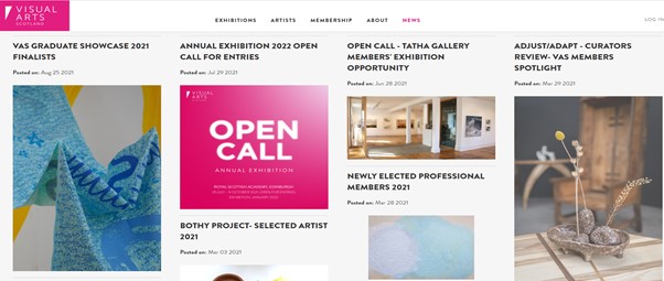 Visual Arts Scotland Website- News of Artist Opportunities including Calls for Work, Projects, jobs, and funding https://www.visualartsscotland.org/news