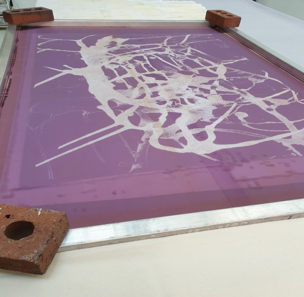 Extensive preparatory work continued to be undertaken given the requirements of such large-scale screen-printing processes especially as several images had to be changed from what was learned through the prior sampling processes. Several screens had to be cleaned, recoated and the original artwork was altered, re-scanned and exposed onto the screens as the scale of the artwork was no longer suitable for larger scale work. To ensure that specific imagery centred around neural connectivity, disruption, and disturbance the multiple imagery gave way to a single very large image. Through doing so the overall scale could be better capitalised upon to visualise the core narrative. Such altered imagery was scanned at the highest resolution which was 1200 within the Wasps studio complex so every nuance and mark made could again be transferred onto the screens. To have the capacity to access such additional equipment and tools like the Brother A3 Print Copy Scanner aided what could be achieved in creative practice. Once uploaded use of the Apple iMac with the latest software installed ensured the textural detailing was captured via Photoshop. At Wasps Studio Complex, Hanson Street, Glasgow I was able to prepare my artwork imagery for the screens for the larger scale screen-printing processes. The number of prepared second-hand screens continued to increase to help expand my creative options given the extensive range of mark making realised from the artwork and the sampling processes.