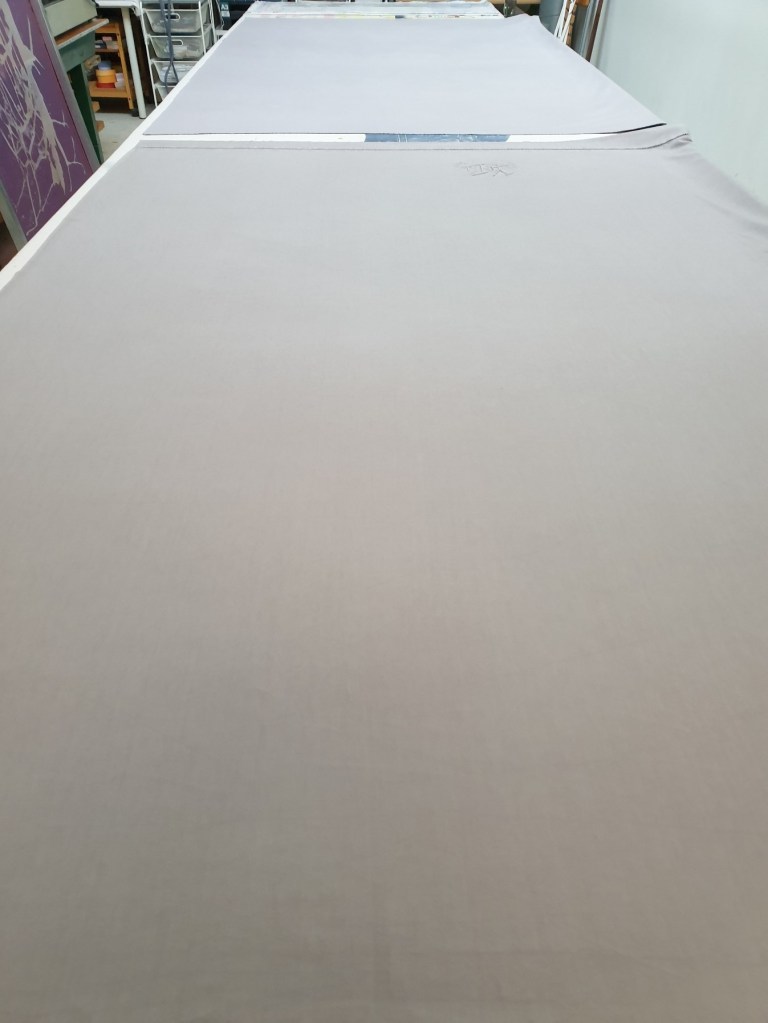 Video clip of screen printing processes with Joanna Kinnersly-Taylor, Textile Artist, to help to illustrate what was required given the scale of screens in use due to the increased size of the artwork imagery. Additional processes needed to be incorporated including the increased separation of roles and responsibilities given the pandemic, COVID-19 and its effects, including the distancing rules in Scotland.Gillian Morris (2021) “I am starting to feel again” Mental Health Recovery- A Visual Account of Emotional Repair. 198cm x 282cm Screen-Printed Vintage Linen Bedsheet using intuitive emotional relating with the materials. Various greys, black, sugarplum pink, and pomegranate printing inks used on vintage dyed grey linen which explored reduced emotional arousal with hand stitching for repair.