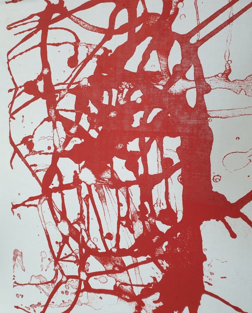 In undertaking such extensive sampling processes from the outset, a lot of the learning, knowledge and understanding gleaned from such processes informed this project of work. Through extensive colour sampling the preferred core colour range was made known and adhered to for the larger scale print work. I was led by the initial research processes of neural mapping and related artwork alongside further investigations concerning neural anatomy and physiology, of relatable colours to human tissue. Human brains are generally grey with black, white and red. As living matter, the brain is comprised of nerves, veins, blood vessels, cells, nerve fibres and neurons and neuro-connectors. The white matter of the brain is made up primarily of axon tracts, within some brain cells. These tracts transmit the electrical signals that the brain cells or neurons, use to communicate and are wrapped in a fatty layer called myelin, which insulates the axons and allows them to conduct signals quickly. The type of fat in myelin makes it look white, so myelin-dense white matter takes on a white hue as well. In contrast, grey matter is mostly neuron cell bodies and non-neuron brain cells called glial cells. These glial cells provide nutrients and energy to neurons. They help transport glucose into the brain, clean the brain of excess chemicals and are thought to affect the intensity of the neurons’ communications in the human brain. These cells are not surrounded by white myelin, they take on the natural greyish colour of the neurons and glial cells which looks pinkish, due to the many tiny blood vessels or capillaries. That considered this understanding helped to inform the colour choices especially the selection of reds through to pinks, greys with white and black. The overall colour palette was paired down as deemed to be more relevant, visually striking and impactful.