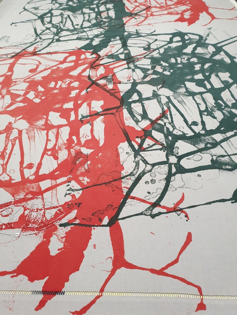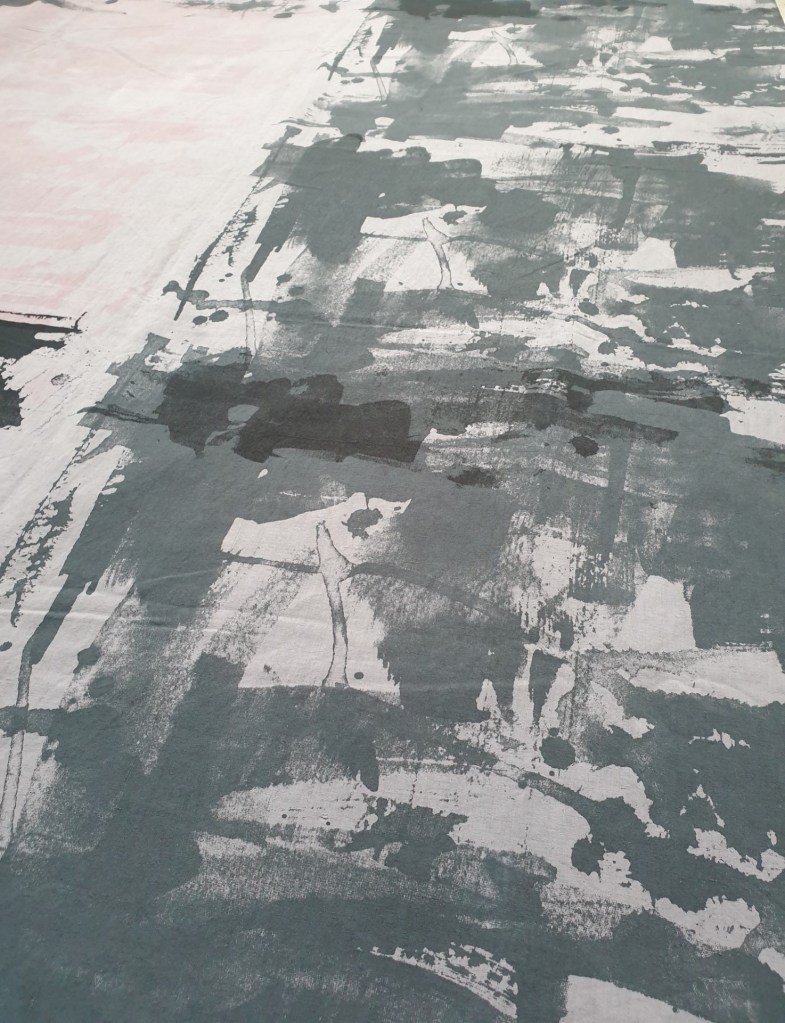 Gillian Morris (2021) Detail from “I no longer want to live” Mental Health Crisis- A Visual Account of Emotional Distress. 203cm x 274cm Screen-Printed Vintage Linen Bedsheet using intuitive emotional relating with the materials. Various greys, black, sugarplum pink, ruby red and pomegranate printing inks used on vintage dyed grey linen which explored greater emotional arousal.