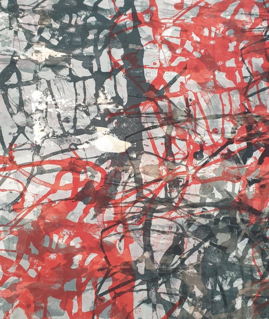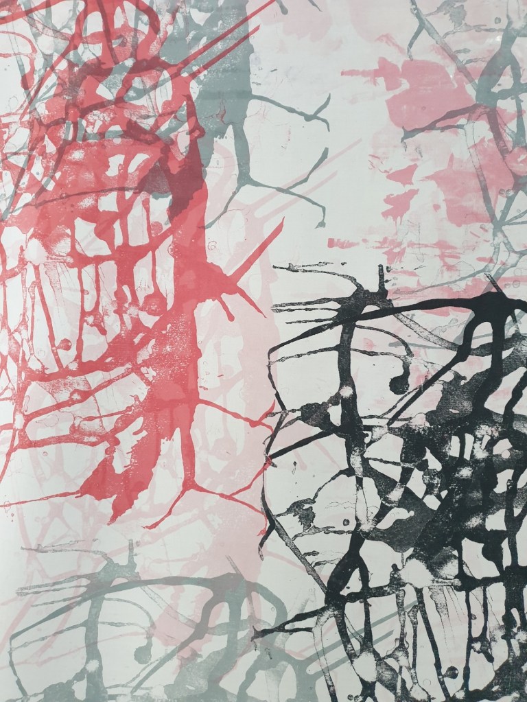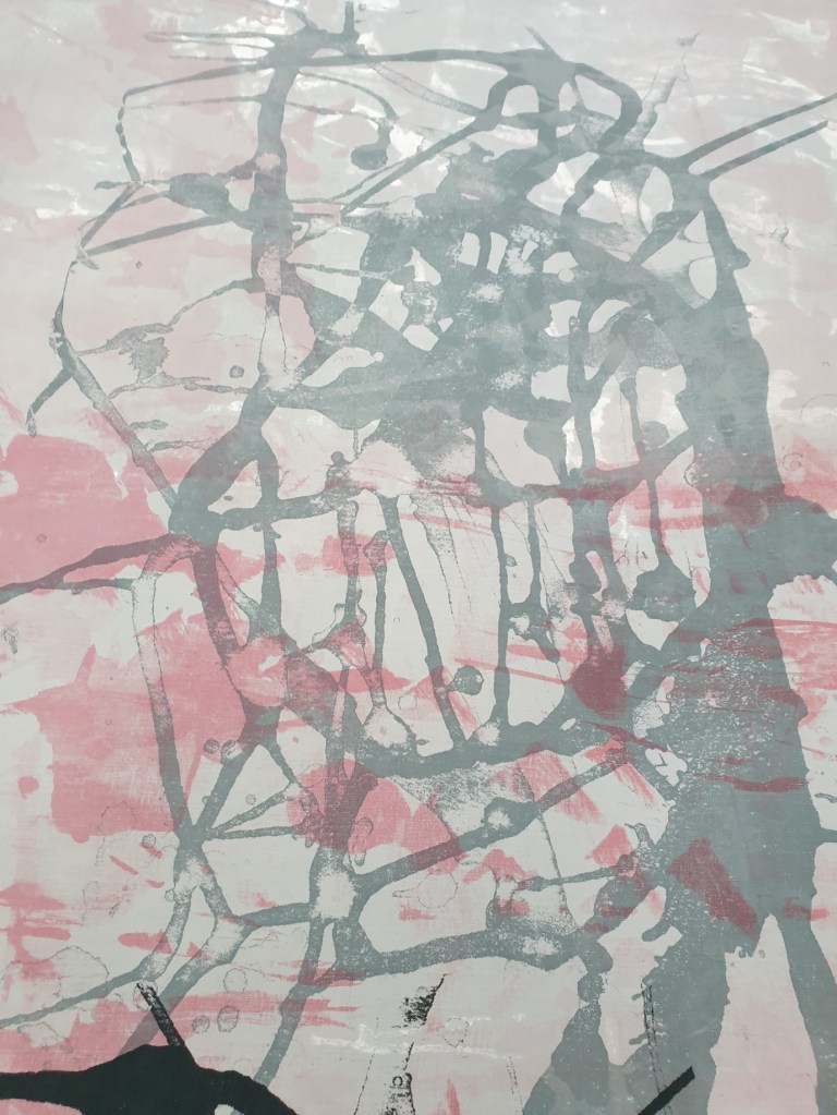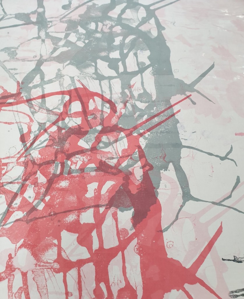 Gillian Morris (2021) Detail from “I no longer want to live” Mental Health Crisis- A Visual Account of Emotional Distress. 203cm x 274cm Screen-Printed Vintage Linen Bedsheet using intuitive emotional relating with the materials. Various greys, black, sugarplum pink, ruby red and pomegranate printing inks used on vintage dyed grey linen which explored greater emotional arousal.Gillian Morris (2021) Detail from “I no longer want to live” Mental Health Crisis- A Visual Account of Emotional Distress. 203cm x 274cm Screen-Printed Vintage Linen Bedsheet using intuitive emotional relating with the materials. Various greys, black, sugarplum pink, ruby red and pomegranate printing inks used on vintage dyed grey linen which explored greater emotional arousal.Gillian Morris (2021) Detail from “I no longer want to live” Mental Health Crisis- A Visual Account of Emotional Distress. 203cm x 274cm Screen-Printed Vintage Linen Bedsheet using intuitive emotional relating with the materials. Various greys, black, sugarplum pink, ruby red and pomegranate printing inks used on vintage dyed grey linen which explored greater emotional arousal.Gillian Morris (2021) Detail from “I no longer want to live” Mental Health Crisis- A Visual Account of Emotional Distress. 203cm x 274cm Screen-Printed Vintage Linen Bedsheet using intuitive emotional relating with the materials. Various greys, black, sugarplum pink, ruby red and pomegranate printing inks used on vintage dyed grey linen which explored greater emotional arousal.