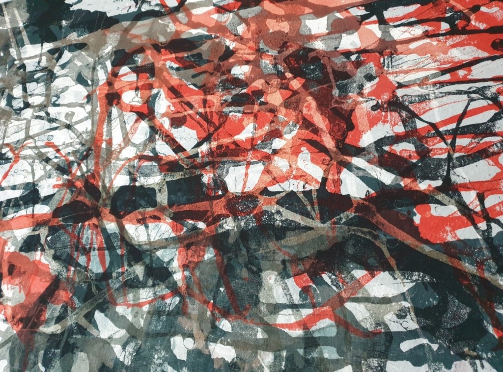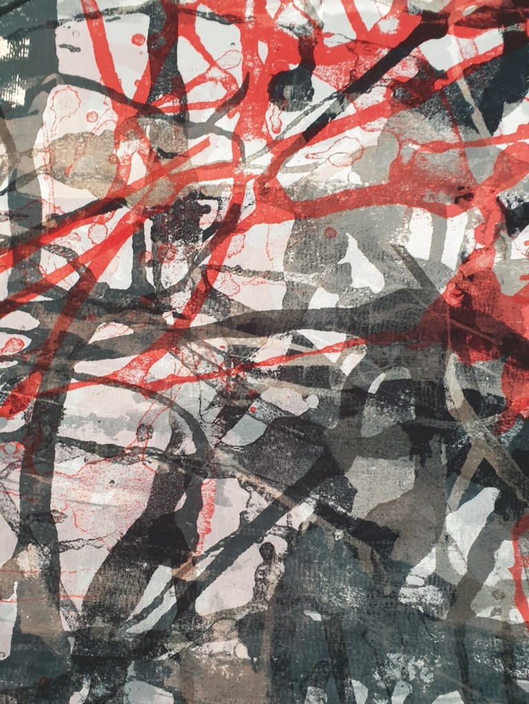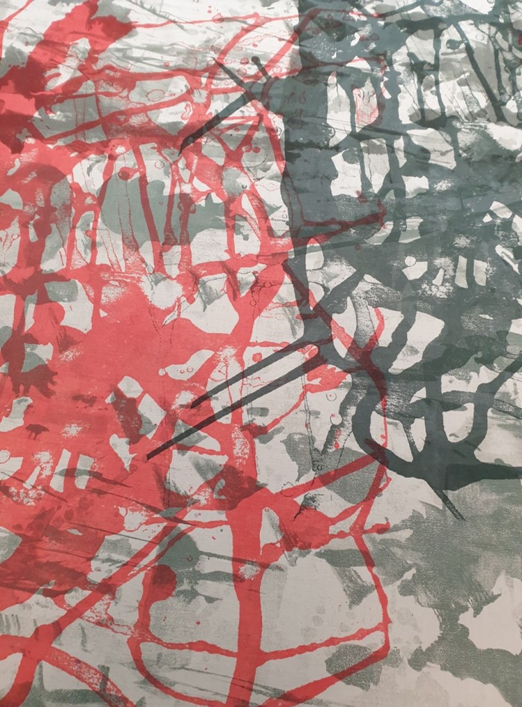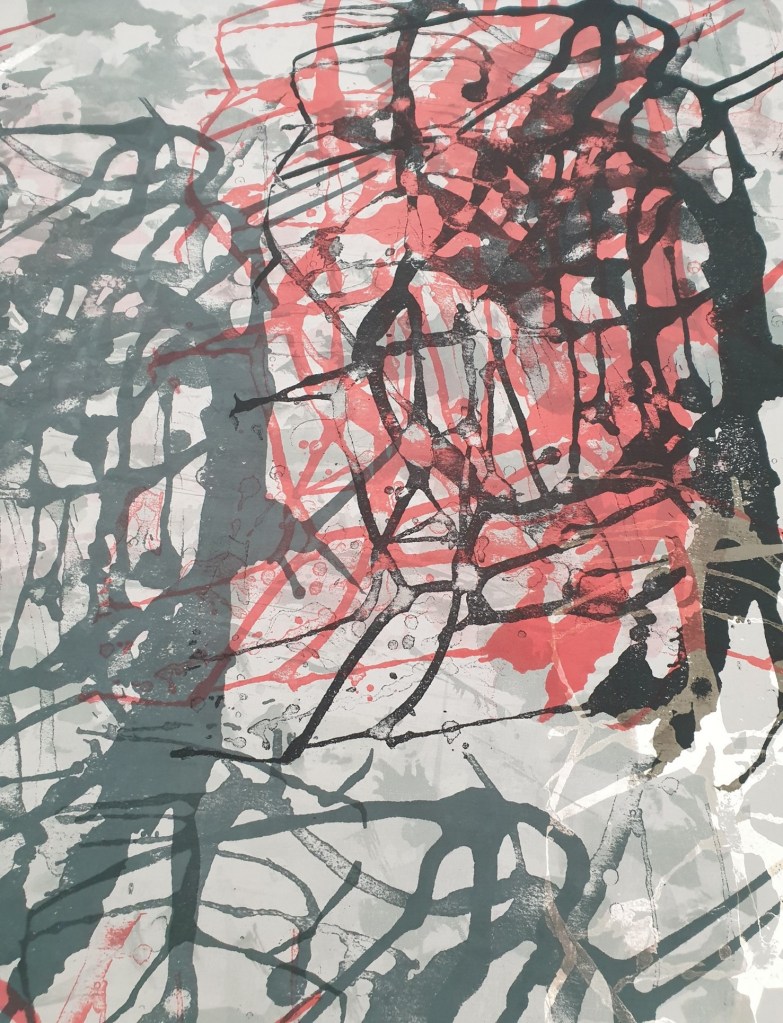 Gillian Morris (2021) Detail from “I no longer want to live” Mental Health Crisis- A Visual Account of Emotional Distress. 203cm x 274cm Screen-Printed Vintage Linen Bedsheet using intuitive emotional relating with the materials. Various greys, black, sugarplum pink, ruby red and pomegranate printing inks used on vintage dyed grey linen which explored greater emotional arousal.Gillian Morris (2021) Detail from “I no longer want to live” Mental Health Crisis- A Visual Account of Emotional Distress. 203cm x 274cm Screen-Printed Vintage Linen Bedsheet using intuitive emotional relating with the materials. Various greys, black, sugarplum pink, ruby red and pomegranate printing inks used on vintage dyed grey linen which explored greater emotional arousal.Gillian Morris (2021) Detail from “I no longer want to live” Mental Health Crisis- A Visual Account of Emotional Distress. 203cm x 274cm Screen-Printed Vintage Linen Bedsheet using intuitive emotional relating with the materials. Various greys, black, sugarplum pink, ruby red and pomegranate printing inks used on vintage dyed grey linen which explored greater emotional arousal.Gillian Morris (2021) Detail from “I no longer want to live” Mental Health Crisis- A Visual Account of Emotional Distress. 203cm x 274cm Screen-Printed Vintage Linen Bedsheet using intuitive emotional relating with the materials. Various greys, black, sugarplum pink, ruby red and pomegranate printing inks used on vintage dyed grey linen which explored greater emotional arousal.