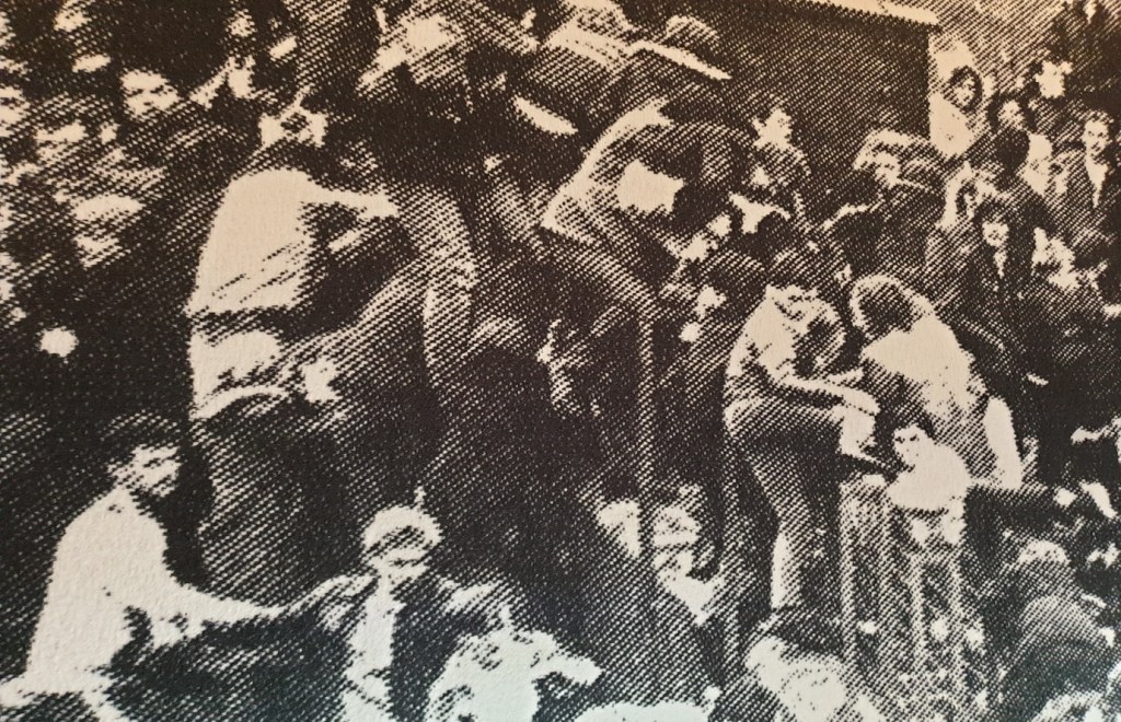 Jamie Holman (2021) Colonial Amusements. The artist reflected upon the term ‘Colonial Amusements’ as located by a Lancashire gambling arcade. He interrogated how entertainment, culture and sport hold the power of attraction and distraction, and their contrary co-existence alongside violence and conflict. Such themes led back to colonial catalysts via the cotton mills of Blackburn. He explored the founding of the football league by mill workers and the evolution of terrace culture, identity and clothing. This artist reflected upon the tensions within young people engaged in war and violence alongside those of warring factions within football.
