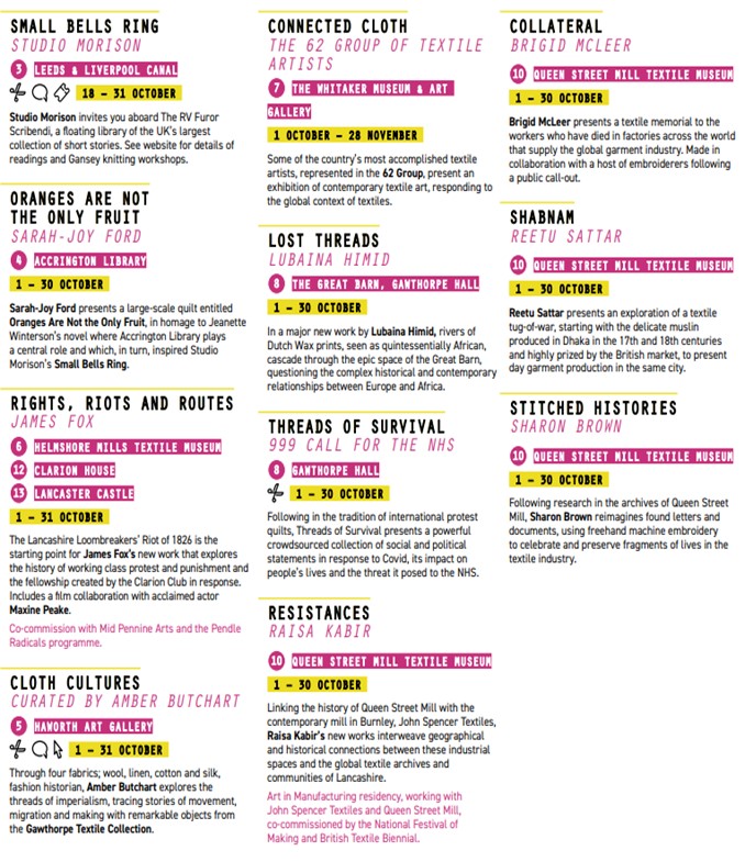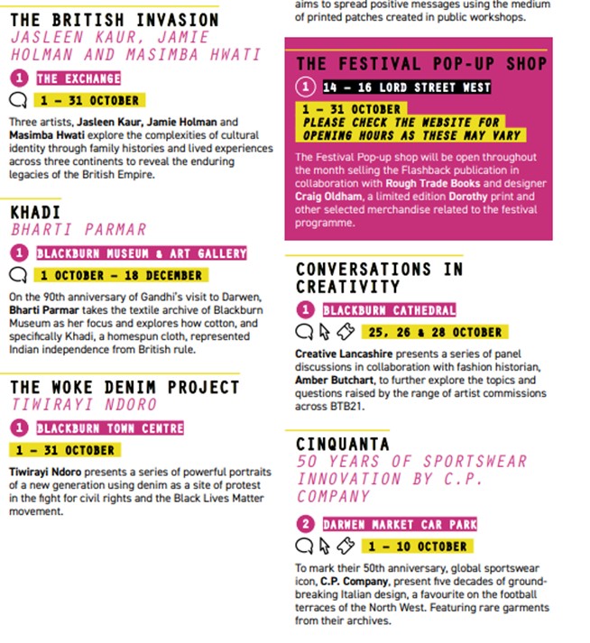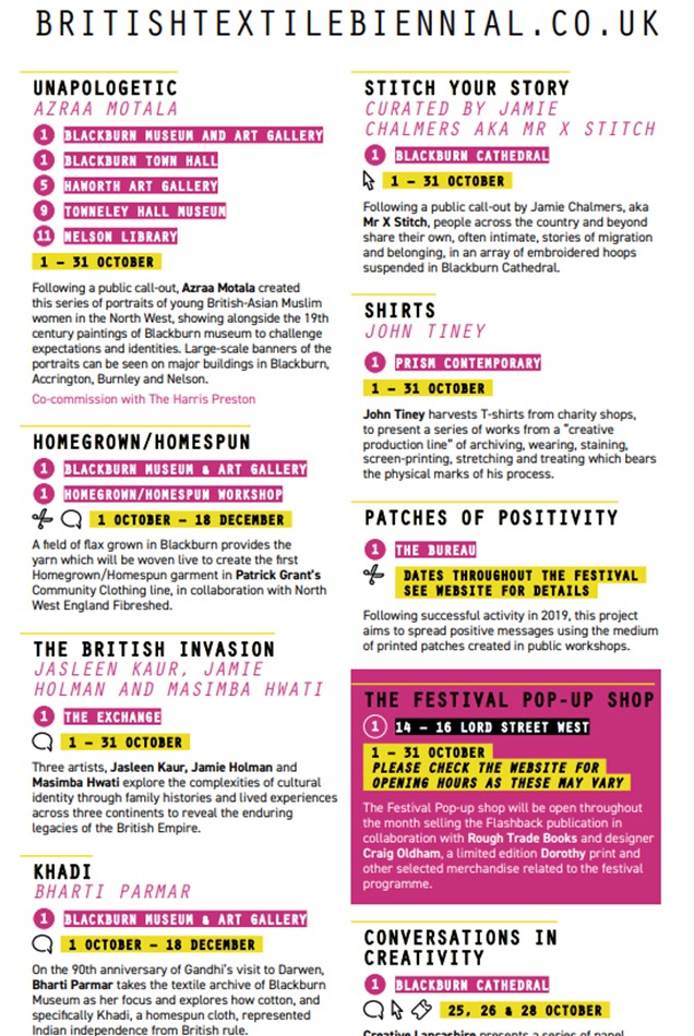The British Textile Biennial highlighted how and why the mass production of cloth on a global, industrial scale has become unsustainable, economically, socially, and environmentally and the increased need for different relationships with textiles to be developed, promoted, and reinforced. Lancashire was once the home of the textile industry, but it has since disappeared. By 2023 it is hoped that homegrown clothing production locally can be increased by Community Clothing as a step towards more sustainable clothes manufacturing.