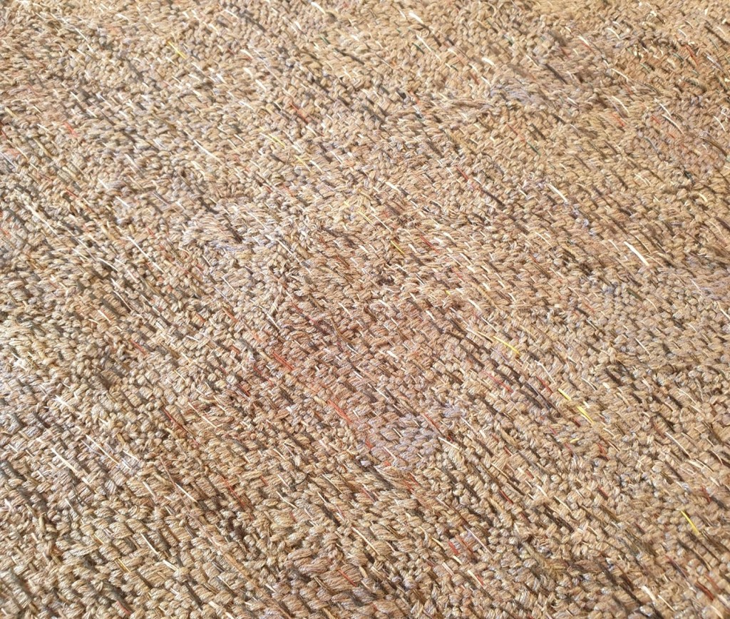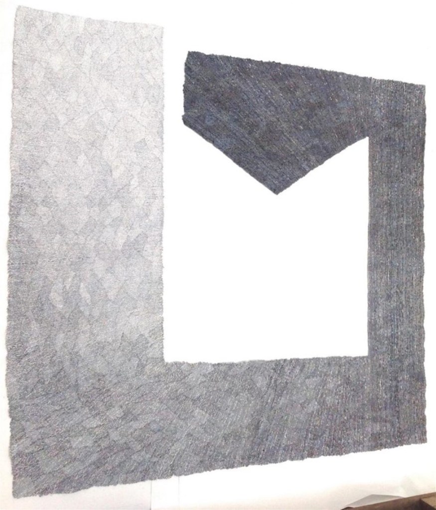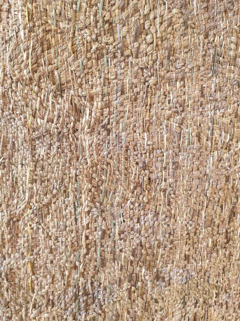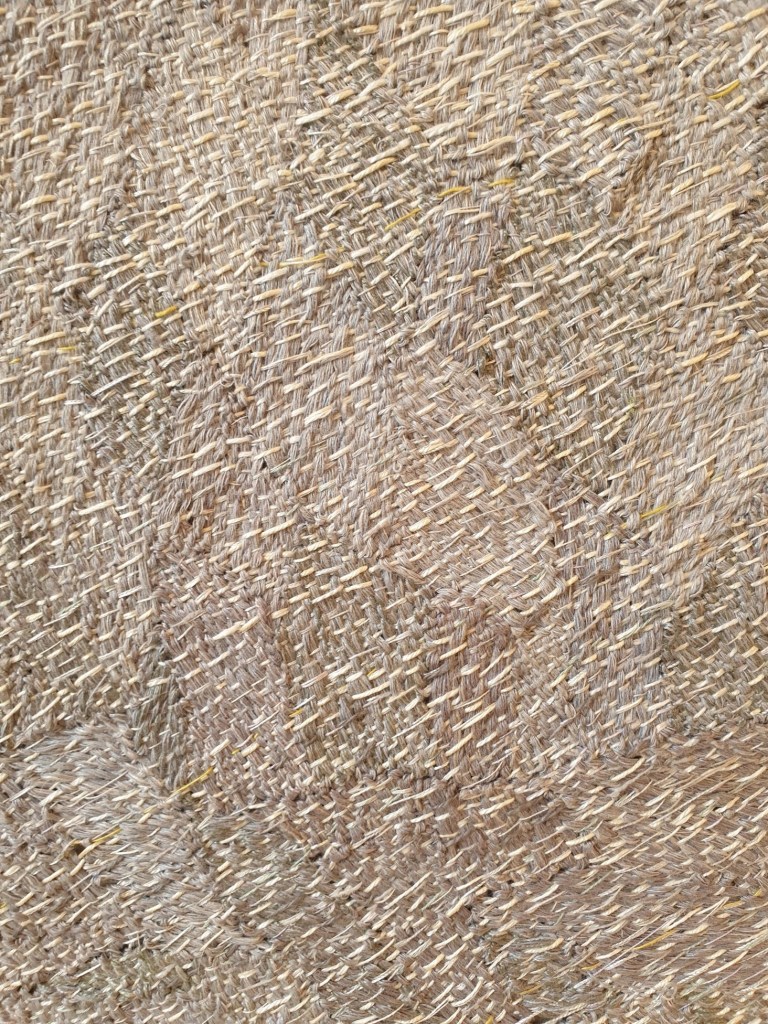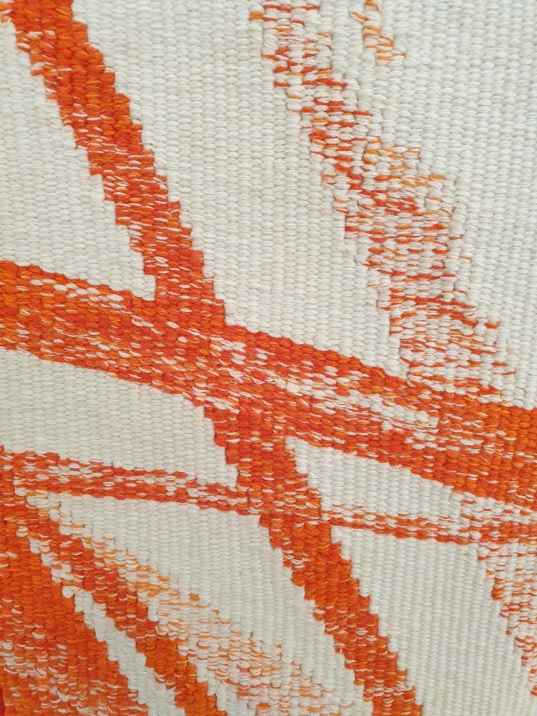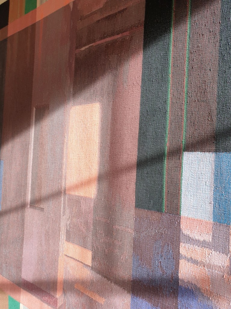 The work Lifetime was created from silk, linen, cotton and paper warp and weft. It references a daily life lived and is “informed by landscape and travel combined with a strong influence in technique, structure and form”. It was considered to be an extraordinary piece by a very gifted artist. When the judges came to the deliberation stages, they themselves who are both incredibly experienced and talented, tapestry artists were so impressed, both were looking at this and they were fascinated by the technique and how it was made. Louise Martin acknowledged that “It’s a fairly subtle piece, it has a lot of paradoxical qualities. So it’s very soft, it’s very fragile, but it’s very rigid, it’s very hard, and it’s very subtle. There are very tiny little incremental changes in it, and yet, it goes through a whole spectrum of shades and textures.” It was considered to be extraordinary with good reason given the complexity of weave construction and layering effects of stitch. It was therefore wonderful to see it in the flesh as it glowed in the sunlight, I could recognise just what a beautiful piece it is as multi-directional areas of weave and stitch reflected the light so well. Although a reasonably flat surface it presented as having multiple surfaces and dimensions given the scale of concentric areas of weave with the use of thread with stitch repeated throughout the tapestry weaving. http://thetapestryprize.org/project/2021cordisprize/