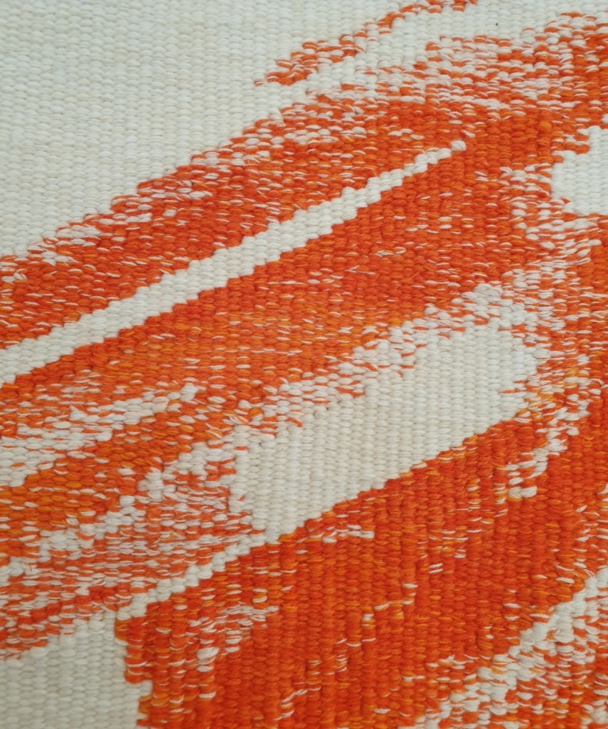 Elaine Wilson only started making this tapestry in April 2020 during the Covid lockdown, when she was furloughed for three months from her job as an apprentice weaver at the Dovecot Studios. The image that she chose to interpret for the design was from one of her own paintings. Elaine Wilson stated that “in my painting practice there is a frantic energy and I like to throw and pour paint, creating drips and pools of colour. I thought it would be interesting to try and express these quite immediate marks in the much slower and considered medium of tapestry weaving by using texture and double weave.” As Elaine Wilson was almost finished her apprenticeship she wished to maintain her learning throughout lockdown and to test herself out with the studio environment. With having no loom and materials at home this weaver ordered an industrial clothes rail online to warp up and use as a loom, as well as wool, a winder, some bobbins, pegs and needles. This creative process helped to focus her continuing development in tapestry weaving, to promote independent work as part of her studio practice. Such techniques, process, and imagery has inspired me to continue to develop my own tapestry weaving in many different ways.