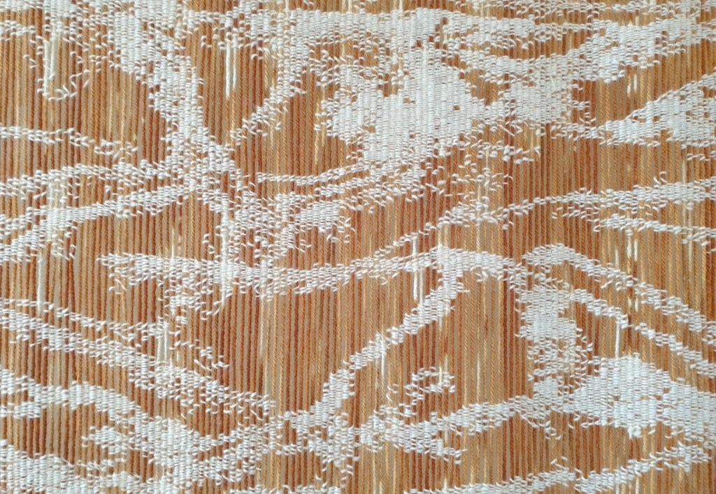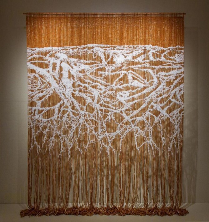 Anne Stabell noted that “Under the Surface is part of a project named Slowly Through the Woods. With these tapestries my intention is to bring the experience of being in the woods among everything that grows, into the gallery in a woven form. The designs are made by leaving parts of the warp unwoven, so that one can see through and between the threads, almost like in a wood with leaves, branches and the air between. The visible warp and the coloured weft are dyed with growths I have collected or grown in my Garden.” Under the Surface was woven using a shibori technique and as stated the wool was dyed with Parmelia saxatilis, which is commonly known as salted shield lichen and grown in Norway. The design itself evolved from imagery including photographs of roots which were combined and digitally manipulated. The use of materials including the natural dyes resulted in a beautifully luminosity and range of tones across the weave.