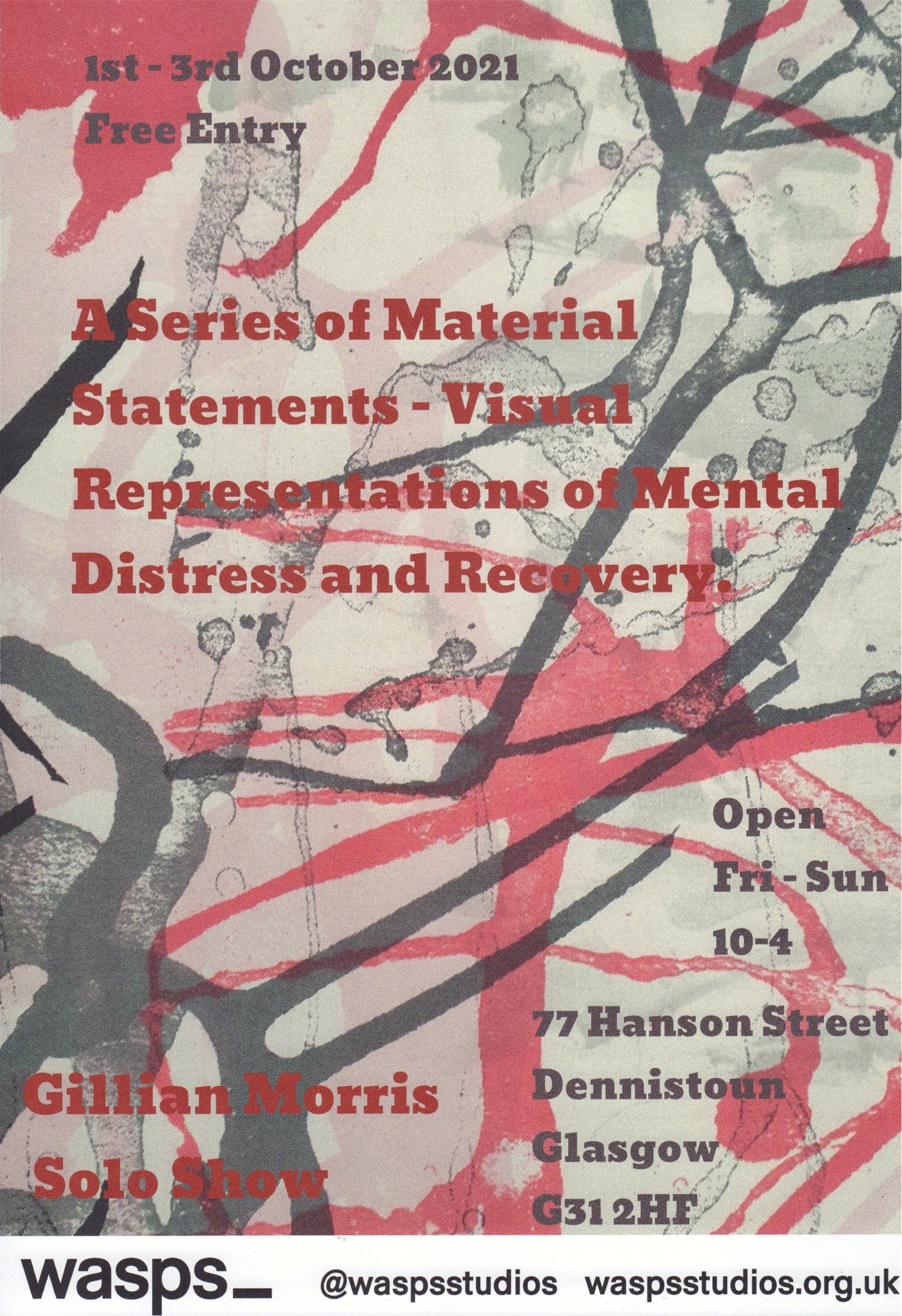 From the start of exhibition planning a promotional strategy was considered, implemented and reviewed in accordance with organising the exhibition and the completion of my project work. An A3 exhibition flyer/poster was created including all relevant and necessary information including free entry, venue details and exhibition dates and times which included imagery of my work which was shared and distributed by Wasps (Workshop & Artists Studio Provision Scotland) which were the main event coordinators. This exhibition poster was used online and offline throughout the Wasps studio complexes especially within the Glasgow area. As similar events at and around my exhibition location are common, many flyers were placed around Wasps Artist Studio Complex and Exhibition Space at Hanson Street which generated interest amongst the artists who were resident there. Other regional and local spaces, including shops, etc, received copies of my exhibition poster and were asked to display the upcoming event. During such occasions time was afforded to discuss the exhibition, my creative process and work whenever interest was expressed.
