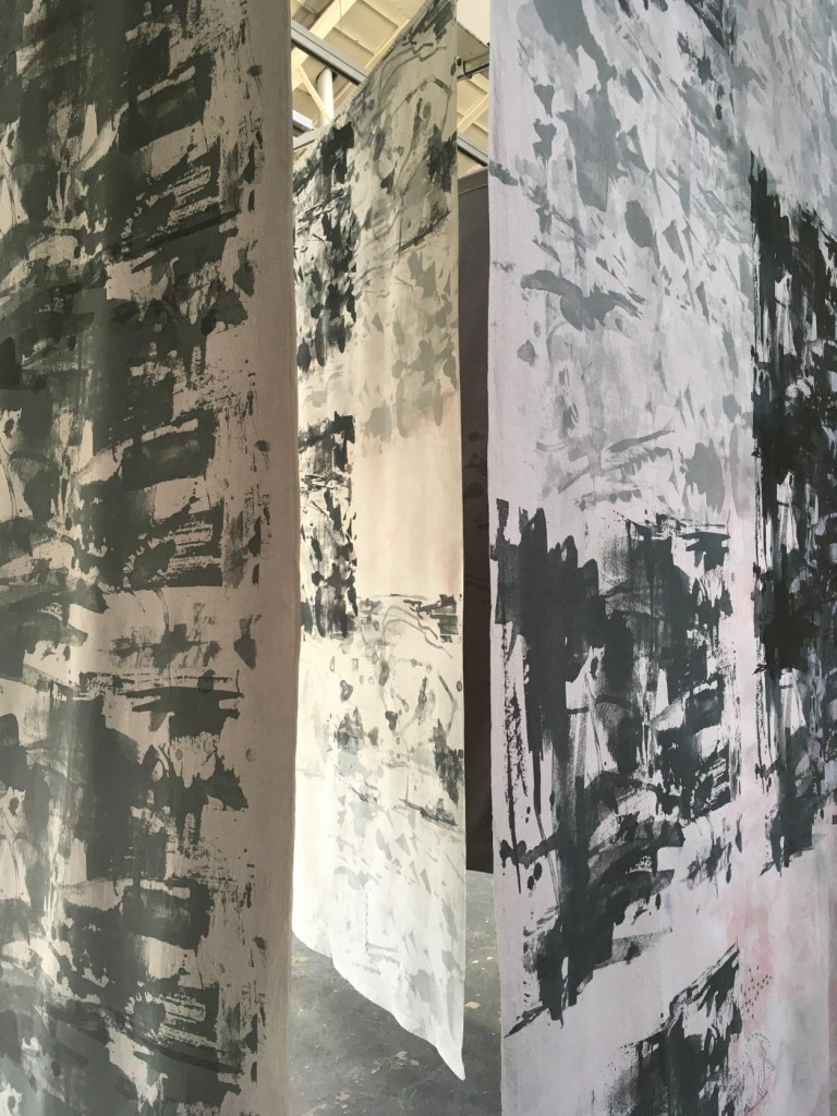 Lizzy Levy noted that I had produced a body of work that demonstrated a high level of visual, aesthetic, and technical understanding of the processes I have adopted. The works exhibited illustrated my skills in print, manipulation of material surface and stitch. These were professionally produced with discernment, resulting in aesthetically pleasing and impactful installation pieces. Such feedback has been fully appreciated and aided my professional growth as a textile artist. It was emphasised that I had undertaken a major project in textiles that does effectively demonstrate a personal identity that my work is uniquely innovative as it expresses my experiences as a psychologist as well as family heritage and personal experience. It has been important that materials have provenance giving a sense of human strife within the bedlinen. The marks and colours reflected parts of the mind, the neural connections made. My work has gathered pace embracing elements that have meaning within my own life so, the work becomes more powerfully unique as my confidence has grown in expressing personal matters through creative practice. I really valued the tutor’s acknowledgement of my hard work, methodical planning in the development and refinement of my works as much effort, time, research, creative focus and emotion was required to create such print and stitch on dyed vintage linen.